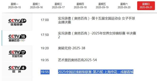 北京时间9月21日20:00,中超联赛第25轮将迎来一场焦点大战,上海申花VS成都蓉城!央视奥林匹克频道CCTV16将进行现场直播。球迷也可通过五星体育以及咪咕视频等平台观赛。联赛领头羊成都蓉城积53分,第三名上海申花积50分,此役将很大程度决定本赛季中超联赛的争冠局势。
