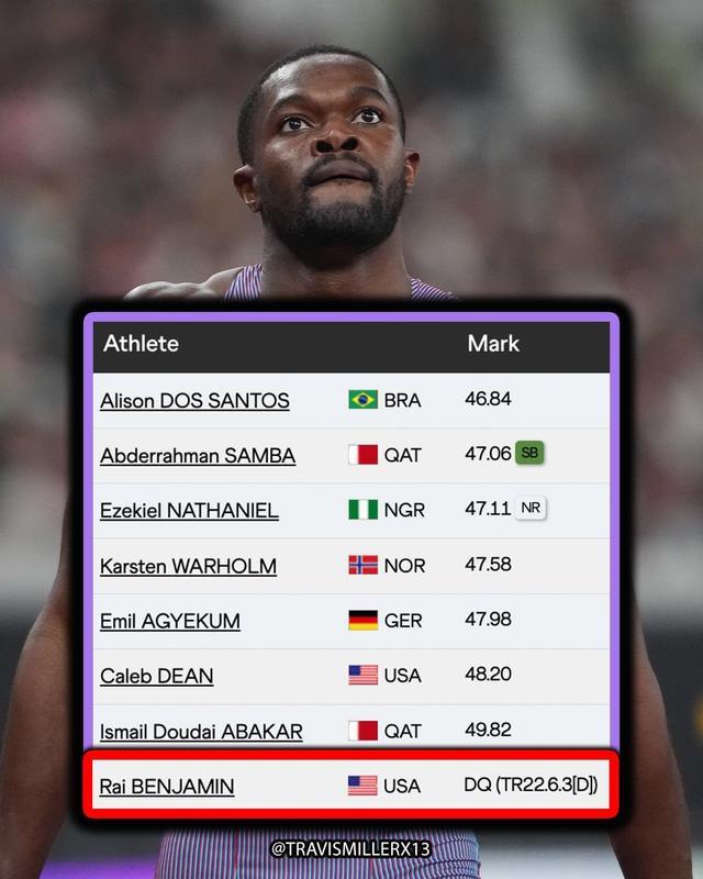9月19日,2025年东京田径世锦赛男子400米栏决赛,巴黎奥运冠军本杰明跑出46秒52的赛季最佳,但随后因碰倒栏架被取消资格。