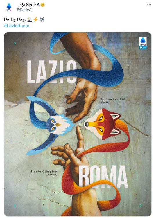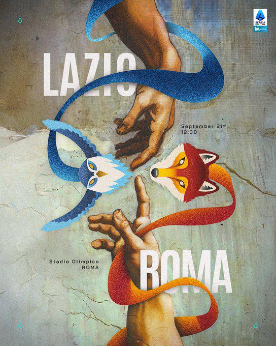 雷速体育9月21日讯 2025/26赛季意甲第4轮拉齐奥主场迎战罗马的比赛将于今天18:30打响。赛前,意甲官方在社交媒体晒出了这场第186次罗马德比的海报。拉齐奥与罗马的图腾“蓝鹰与红狼”在这张海报中清晰可见。
