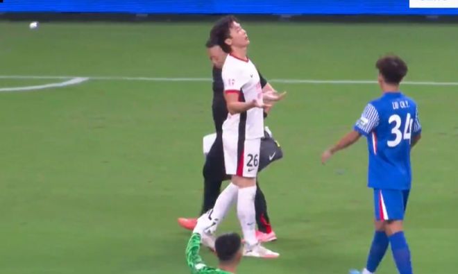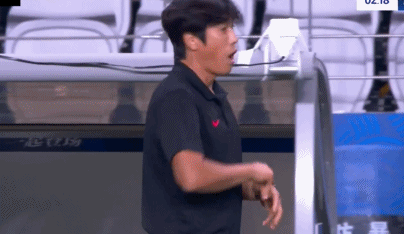 从慢镜头来看,刘诚宇一肘打在了元敏诚的面部。主裁判向刘诚宇出示黄牌,但徐正源非常不满,不断在边线做出挥肘的动作,示意主裁判应该出示红牌。