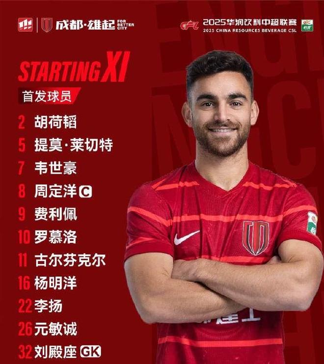 成都蓉城首发:32-刘殿座、2-胡荷韬、5-提莫-莱切特(F)、11-古尔芬克尔(F)、22-李扬、26-元敏诚、8-周定洋、10-罗慕洛(F)、16-杨明洋、7-韦世豪、9-费利佩(F)
