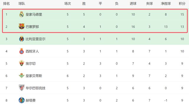 本场过后,巴萨前5轮4胜1平拿到13分,继续追赶榜首的皇马。在西甲积分榜上,皇马5场全胜,以15分毫无悬念排名第一,巴萨落后对手2分屈居第二。由于开局低迷,马竞前5轮过后才拿到6分,已经被榜首两强彻底甩开。赛季才开始1个月,西甲又变成了“二人转”。