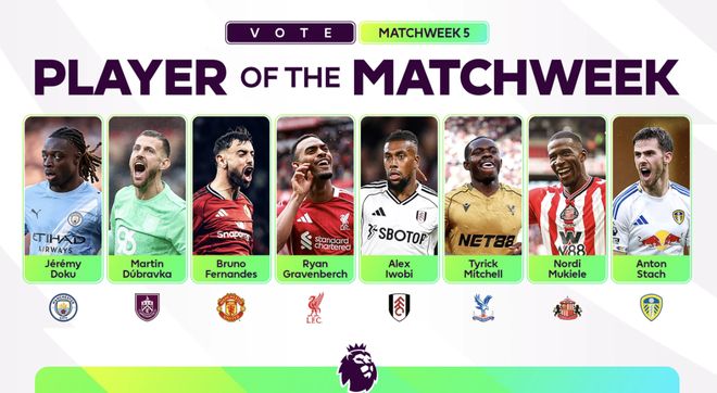 雷速体育9月22日讯 英超官方公布了第五轮最佳球员的候选。其中,多库、B费、赫拉芬贝赫在列。