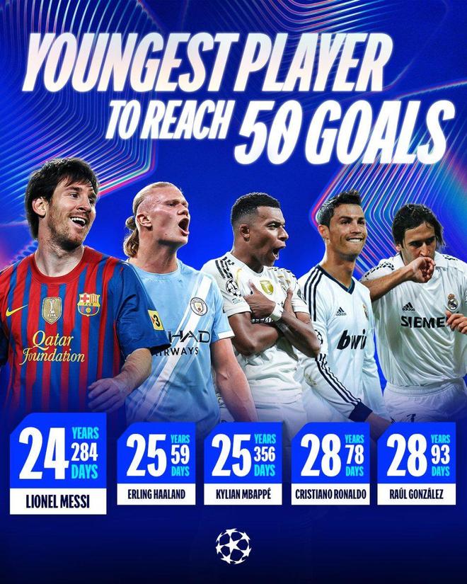 近日,欧冠官方公布了欧冠最快50球的排名,梅西以24岁284天的年纪成为欧冠史上最年轻50球先生。