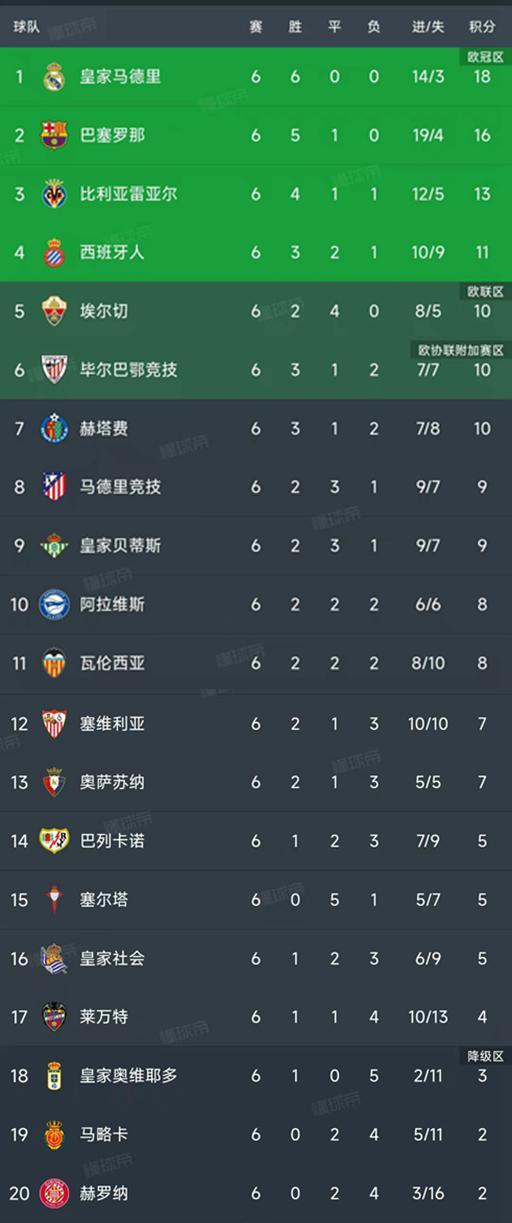 西甲第6轮结束了所有比赛,最新积分榜如下!
