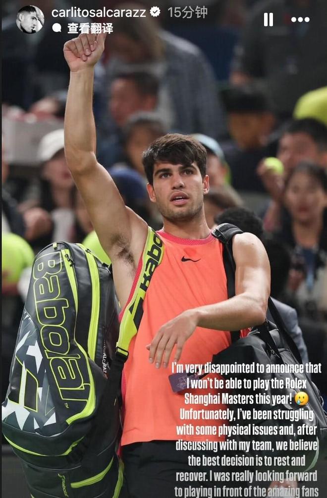 北京时间9月30日,西班牙网球名将阿尔卡拉斯更新社媒,表示因身体原因无法参加上海大师赛。
