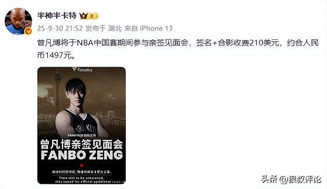北京时间10月1日,根据媒体人“半神半卡特”的报道,今年NBA中国赛期间,中国球员、篮网前锋曾凡博将参与亲签见面会。除了曾凡博之外,还有韦德、加内特和马布里等名宿也将参加亲签见面会。价格则是有点小贵,曾凡博的亲签见面会签名+合影收费210美元,约合人民币1497元。根据此前的媒体报道,曾凡博和篮网签下了一份Exhibit-10 合同。接下来的目标是冲击双向名额。但若是签名+合影收费为210美金,那么这一份收入可能会比他在篮网时期的工资更高。