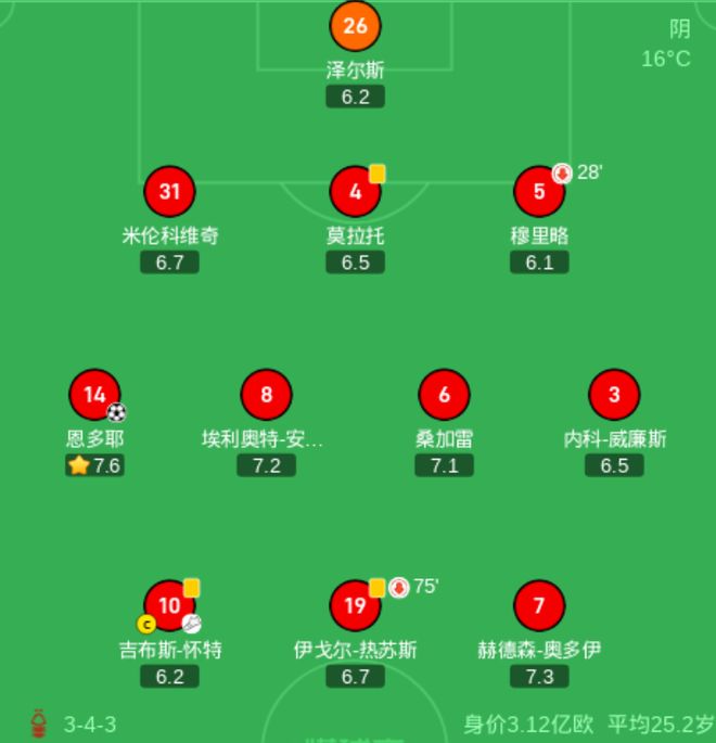 本场比赛诺丁汉森林排出了343阵型。吉布斯-怀特、伊戈尔-热苏斯和赫德森-奥多伊组成进攻三叉戟。恩多耶、安德森、桑加雷和内科-威廉斯4中场联袂出击。米伦科维奇、莫拉托和穆里略3后卫首发出战。泽尔斯担任首发门将。克里斯-伍德和多明格斯坐在替补席待命。