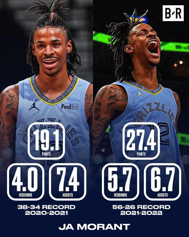 除了出勤率糟糕外,出战的比赛里,莫兰特的表现也没有那么让人满意。我们会记得,2021-22赛季,三年级的莫兰特带着灰熊突然崛起,那一年常规赛,他场均可以拿到27.4分5.7篮板6.7助攻,投篮命中率49.3%,三分命中率34.4%,真实命中率57.5%。由于个人表现与球队战绩出色(56胜26负,前一年只有38胜34负),莫兰特不仅当选了进步最快球员,还入选了全明星和最佳阵容二阵(当时还没有65场规定)。