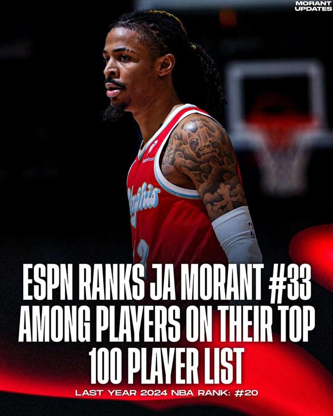 在一个讲究三分和效率的时代,莫兰特的打法非常与众不同,这种打法给他带来了大量关注,但也给他的身体带来了不少负荷,如何用更加高效的方式得分、减少受伤频次会是莫兰特未来进步的关键。值得一提的是,此前ESPN的新赛季百大球员排名,莫兰特只排在了第33位,作为对比,2022年打出生涯高光后,莫兰特可是在ESPN的百大中名列第9,上赛季他的名次则是第20,新赛季掉到33,多少也能看出来媒体对他的不信任和不看好。