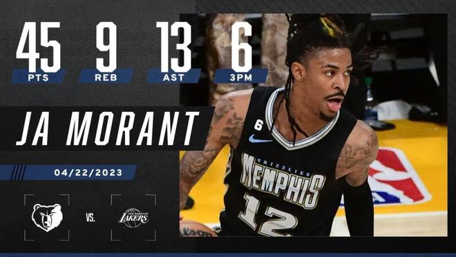 然后是2022-23赛季,莫兰特的表现依然是全明星级别,场均拿到26.2分5.9篮板8.1助攻,得分降低,但助攻生涯最高,灰熊也取得了51胜。虽然灰熊季后赛首轮被湖人黑七(灰熊有伤病原因),但是系列赛,莫兰特场均交出24.6分6.8篮板7.0助攻,G2更是单场拿下45分9篮板13助攻,绝对称得上虽败犹荣。