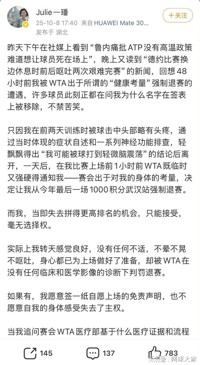 一位网友评论道:“如果运动员感觉良好却无法参赛,这保护的是谁的利益?”但是也有网友表示理解:“脑震荡潜在风险巨大,WTA谨慎行事无可厚非。”