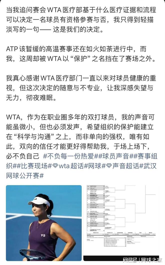 徐一璠呼吁,“我真心感谢WTA医疗部门一直以来对球员健康的重视,但这次决定的随意与不专业,让我深感失望与无力,彻夜难眠。”
