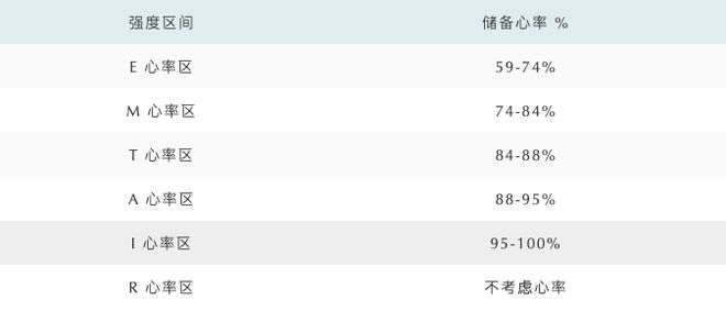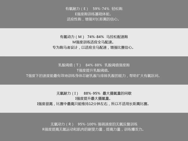 E强度帮你打下扎实的有氧基础,M强度是跑马拉松赛事时的平均配速,T 强度训练能够有效扩展跑者的有氧区间,A强度是T到I之间的无氧过渡区,I强度是为了刺激最大摄氧量的配速,R强度是在提升跑步的经济性。