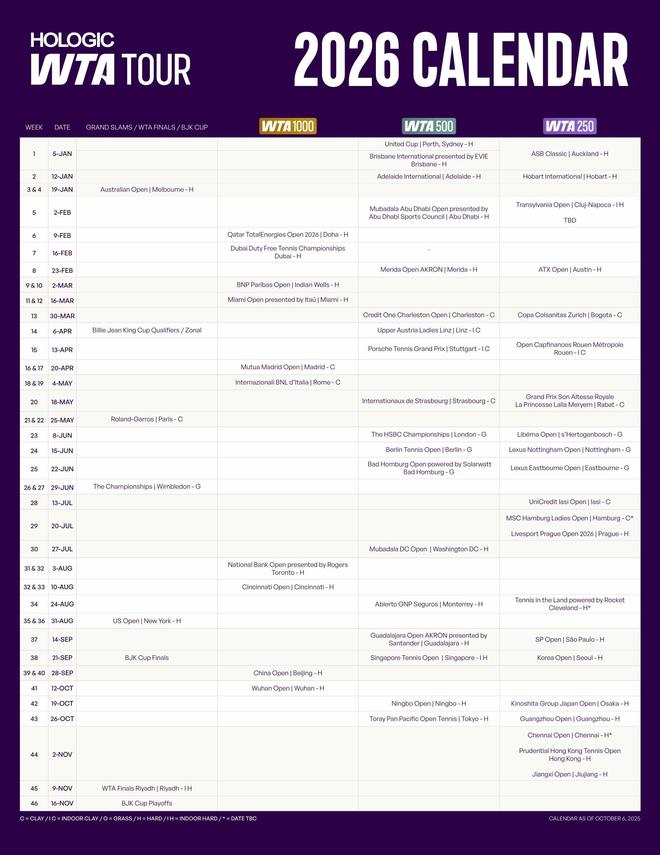 国际女子网球协会(WTA)今日公布2026赛季赛历,将包括遍布26个国家和地区的50多站赛事和四大满贯。