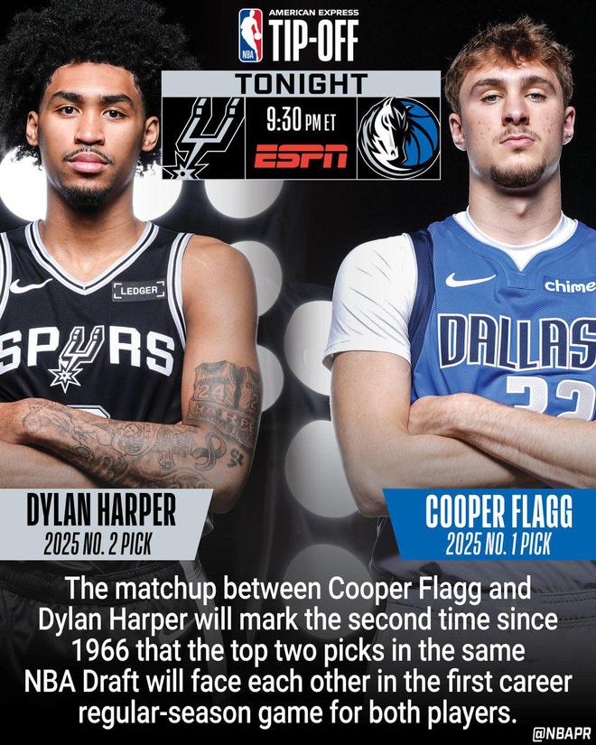 雷速体育10月23日讯 NBA常规赛拉开帷幕,独行侠在今天的揭幕战中主场迎战马刺。据NBA官方统计,弗拉格和哈珀今天在揭幕战的对决,是自1966年以来,第二次出现同一届NBA选秀的前两名选秀球员在各自职业生涯的第一场常规赛中相遇。第一次发生在2015年10月28日,当时是唐斯(状元,明尼苏达森林狼队)对阵拉塞尔(榜眼,洛杉矶湖人队)。弗拉格是今年NBA的状元秀,哈珀是马刺选中的榜眼秀。