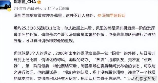当时,深圳男篮跟队记者郑志鹏发文提到佩里的情况点评篮球是5个人的运动,2000年出生的佩里难言是一名“职业”的外援,从日常训练到上场比赛,情绪化的球风、消极的防守、“热衷”抱怨队友、更衣室“点燃器”。第一阶段最后一场比赛结束后,周鹏指导在赛后新闻发布会的表态,可以与之进行验证。他的原话是:“我们有的队员,场上没有职业精神,违背了一个球员的基本准则。觉得自己比所有人厉害,把团队利益置于最底层。”北控男篮新赛季完成了主帅更替,张庆鹏出任25-26赛季的主教练,大牌外援萨林杰并没有留队,有消息称与广东男篮达成一致。张庆鹏作为CBA少帅之一,在天津男篮职业生涯并不算特别成功,身处一支投入较大的俱乐部效力,他能否率队走得更远,相信是外界关注的焦点。
