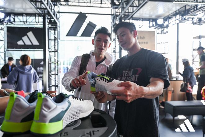 现场阿迪达斯专属展区同步开放全尺码 DROPSET 3 全力战将力量训练鞋供现场观众上脚试穿,感受产品在实际训练中的稳定与支撑。展区前人气高涨,吸引众多选手和观众驻足体验,他们纷纷试穿并在现场打卡留念。