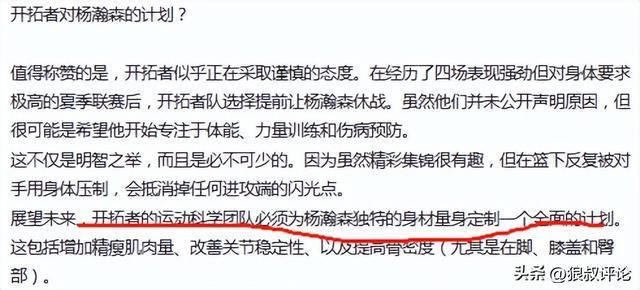 至于增重的话题,实际上杨瀚森结束了夏季联赛后,美国记者Yasmin Edañol曾报道,开拓者的运动科学团队必须为杨瀚森独特的身材量身定制一个全面的计划。这包括增加精瘦肌肉量、改善关节稳定性、以及提高骨密度(尤其是在脚、膝盖和臀部)。阻力训练、核心力量训练和增强式训练必须成为日常训练的一部分。营养和恢复方案应该达到顶级水平,确保他在安全增重的同时保持灵活性。