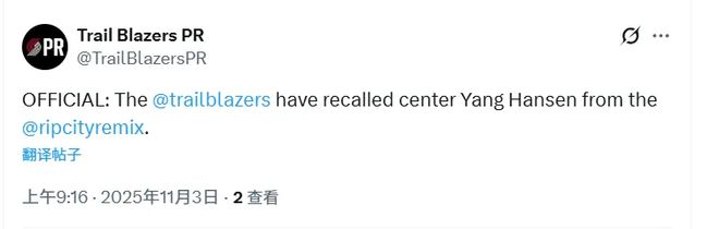- NBA | 开拓者官宣召回杨瀚森!未来下放只训练不比赛队记解析核心原因