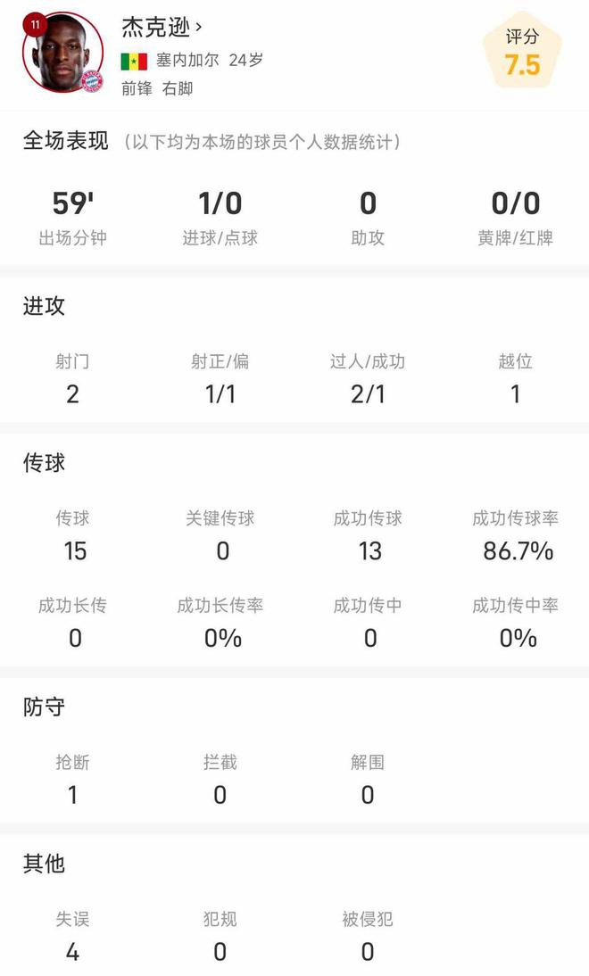 雷速体育11月2日讯 北京时间今天凌晨,拜仁在德甲比赛中3-0大胜勒沃库森,杰克逊本场比赛出场59分钟,比赛第32分钟打入1球。