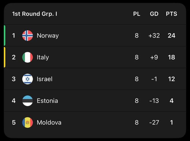 尤其是第3轮主场面对意大利,挪威队直接3-0轻取对手。这场比赛胜利,直接为挪威队奠定的出线基础。而在面对小组最弱对手摩尔多瓦时,挪威队也展现了自己的进攻实力。两回合双杀摩尔多瓦的同时狂轰16球仅丢1球。仅在摩尔多瓦身上,挪威队便狂揽15个净胜球。这在“同分情况下排名比较净胜球”的规则中,直接让挪威队立于不败之地。