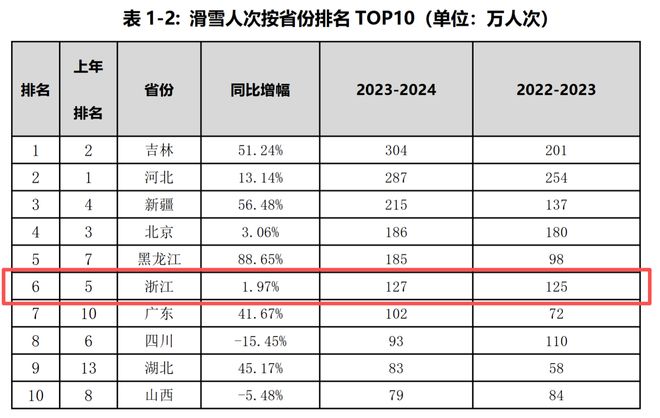 浙江滑雪人次在全国省份排名第六。(图/《2023—2024中国滑雪产业白皮书》截图)