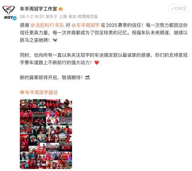随后,周冠宇工作室发文对法拉利车队及车迷朋友致以最诚挚的感谢,并表示新的篇章即将开启。