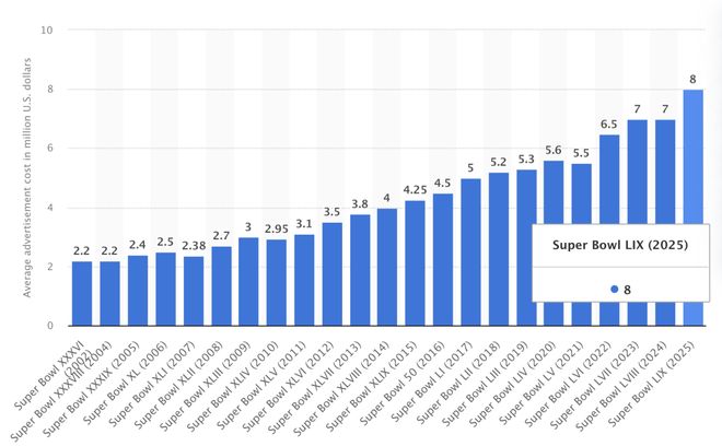 不过,考虑到2025年超级碗平均每30秒的广告报价已经达到800万美元,2026年的平均报价或许还将提升,也将进一步创下该赛事广告费用的历史纪录(注意这仅仅只是投放价格,不包含制作费等),看得出来凯迪拉克车队在打开市场方面是真敢下血本啊......